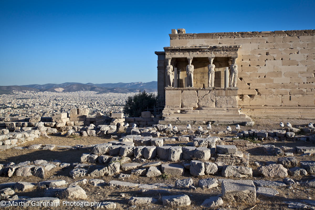 The Erechtheion ancient Greek temple on the north side of the Acropolis of Athens in Greece.