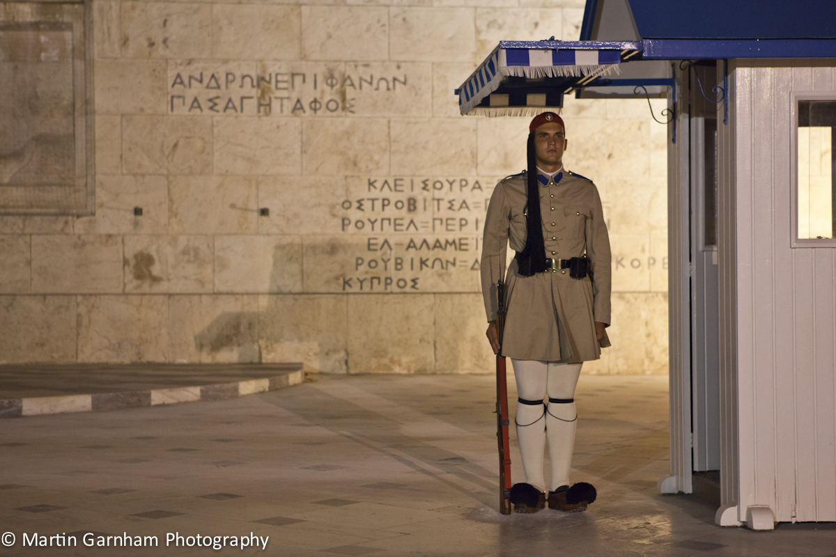 Evzones in front of the Tomb of the Unknown Soldier at the Hellenic Parliament in Athens, Greece.