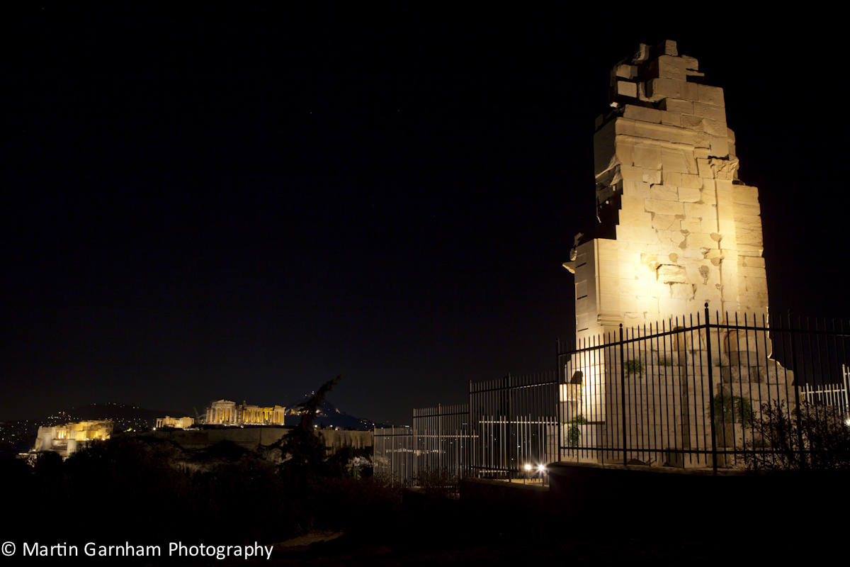 The Philopappos Monument on Mouseion Hill with the Acropolis in background in Athens, Greece.