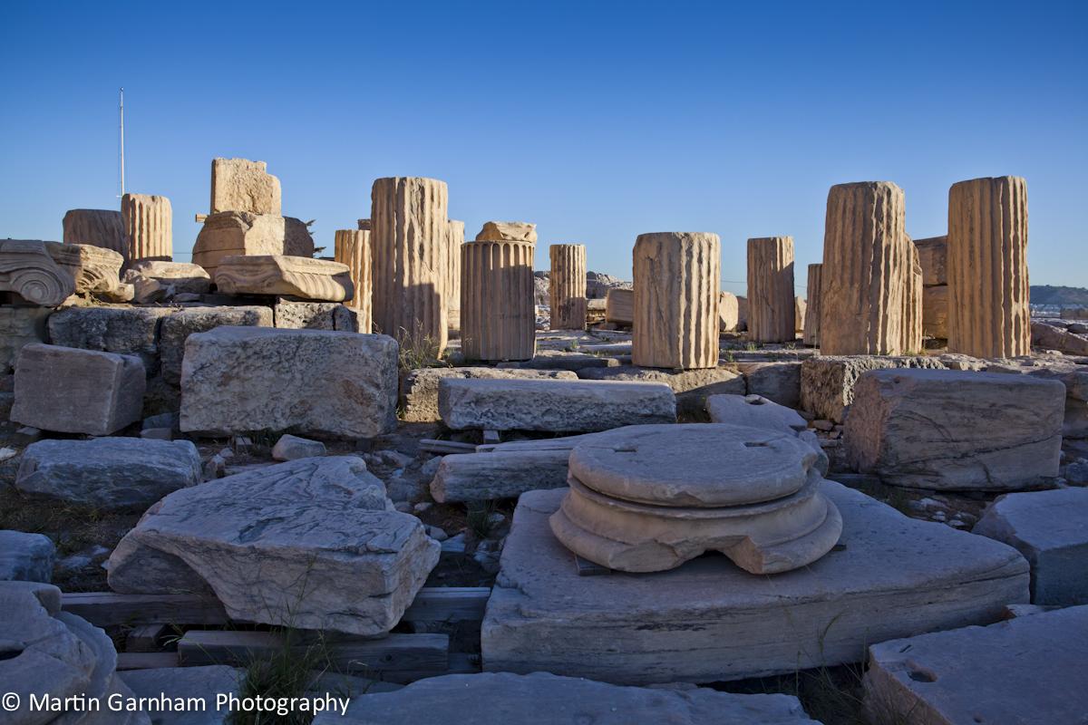 Columns in front of The Parthenon in the Acropolis in Athens, Greece.