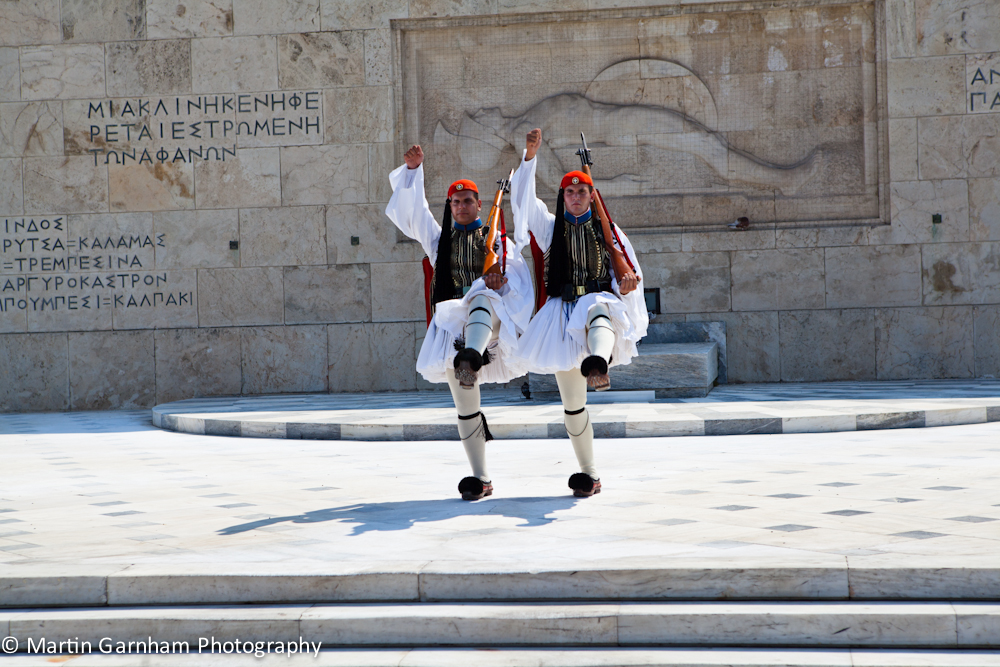 Two Evzones guarding the Hellenic Parliament in Athens, Greece.