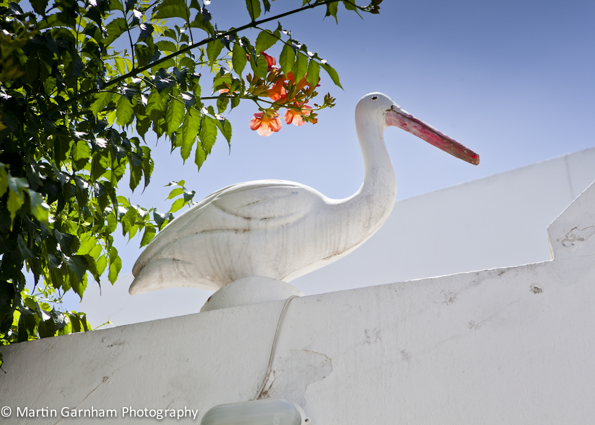 A stone statue of a bird on a wall in Parikia, Paros, Greece.