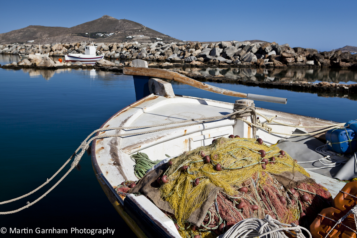 Fishing boats in the port and town of Naoussa in Paros, Greece.