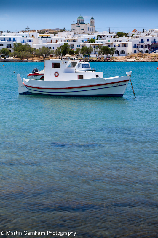 Scene from Agii Anargiri beach in Naoussa in Paros, Greece.