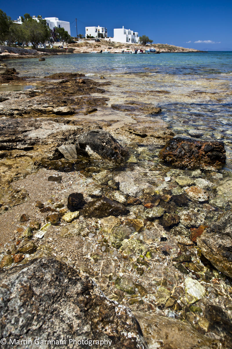 Scene from Agii Anargiri beach in Naoussa in Paros, Greece.
