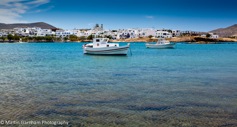 Scene from Agii Anargiri beach in Naoussa in Paros, Greece.