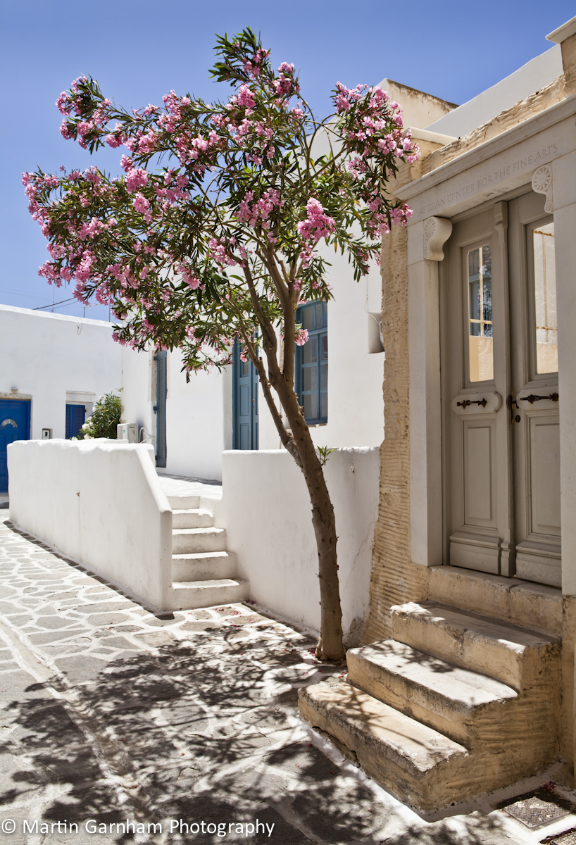Typical street scene in Parikia, Paros, Greece.