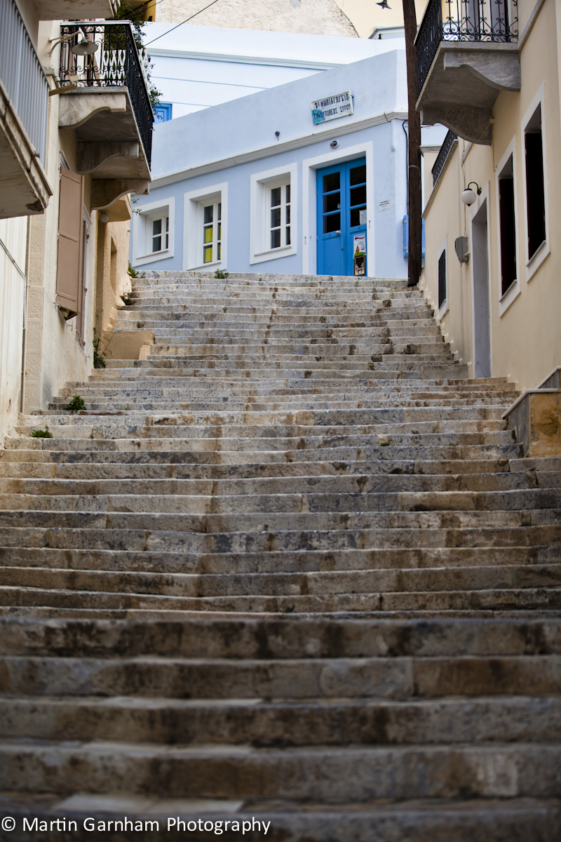 Houses and the facade of buildings in the Island of Syros in the Greek Islands.