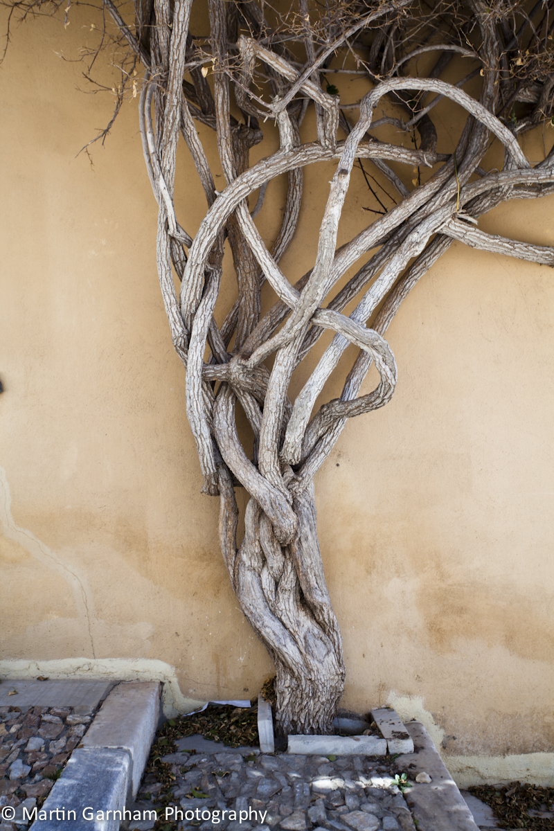 Twisted tree roots against a street wall in Syros, Greek Islands