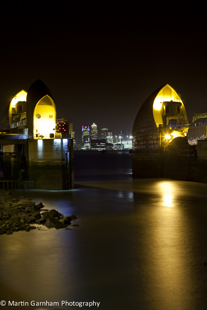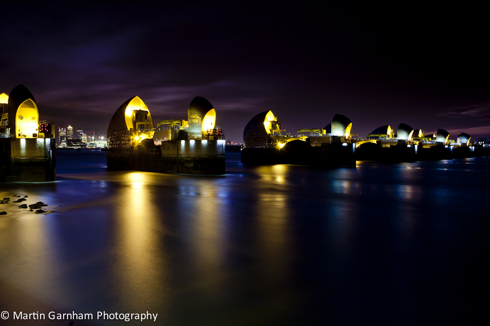 The Thames Barrier at night with Canary Wharf and the o2 in the background. f/8.0 37Sec 100 iso