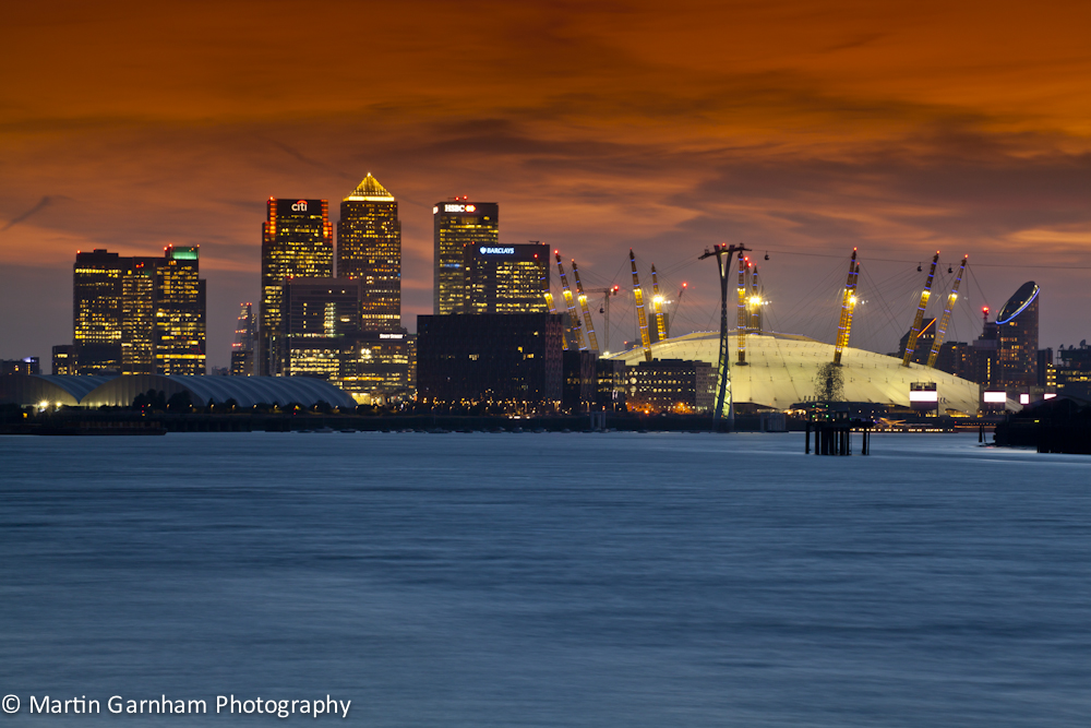 Canary Wharf at night in the city of London.